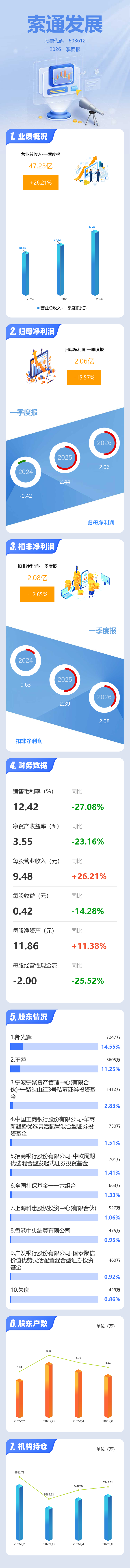 证券之星消息,索通发展2026年一季报显示,一季度公司主营收入47.23亿元,同比上升26.21%;归母净利润2.06亿元,同比下降15.57%;扣非净利润2.08亿元,同比下降12.85%;负债率62.07%,投资收益-715.37万元,财务费用8445.5万元,毛利率12.42%。