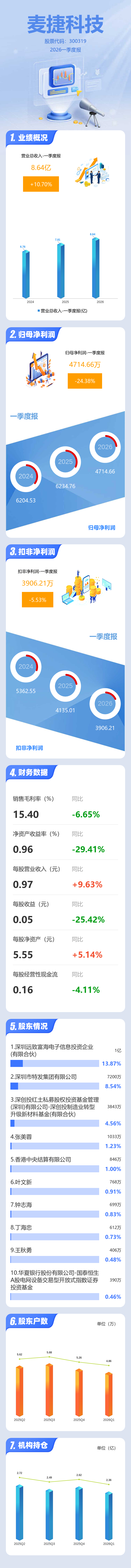 证券之星消息,麦捷科技2026年一季报显示,一季度公司主营收入8.64亿元,同比上升10.71%;归母净利润4714.66万元,同比下降24.38%;扣非净利润3906.21万元,同比下降5.53%;负债率32.16%,投资收益308.83万元,财务费用527.82万元,毛利率15.4%。