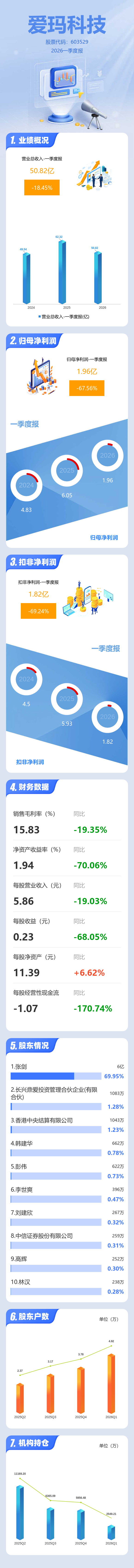 证券之星消息,爱玛科技2026年一季报显示,一季度公司主营收入50.82亿元,同比下降18.45%;归母净利润1.96亿元,同比下降67.57%;扣非净利润1.82亿元,同比下降69.25%;负债率58.6%,投资收益595.62万元,财务费用-2171.64万元,毛利率15.83%。