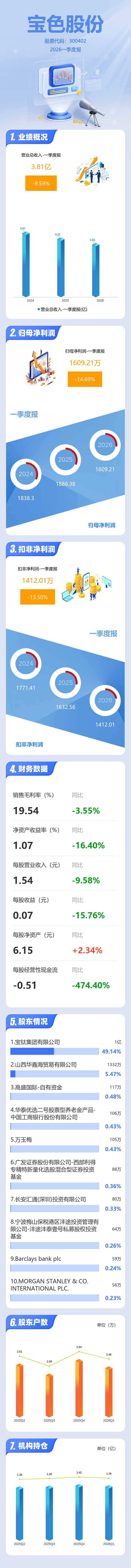 证券之星消息,宝色股份2026年一季报显示,一季度公司主营收入3.81亿元,同比下降9.59%;归母净利润1609.21万元,同比下降14.69%;扣非净利润1412.01万元,同比下降13.51%;负债率40.34%,财务费用217.17万元,毛利率19.54%。