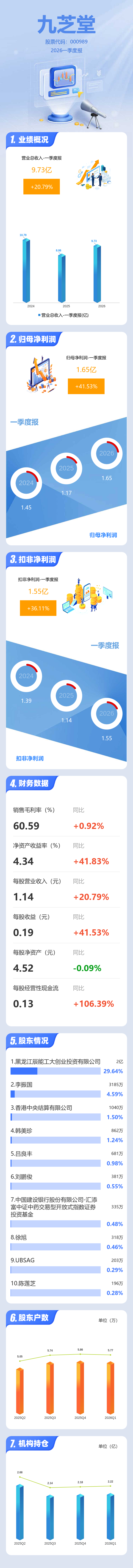 证券之星消息,九芝堂2026年一季报显示,一季度公司主营收入9.73亿元,同比上升20.8%;归母净利润1.65亿元,同比上升41.53%;扣非净利润1.55亿元,同比上升36.11%;负债率25.09%,投资收益762.36万元,财务费用1.68万元,毛利率60.59%。