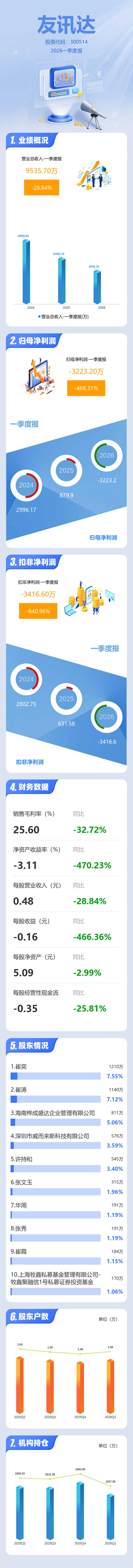 证券之星消息,友讯达2026年一季报显示,一季度公司主营收入9535.7万元,同比下降28.85%;归母净利润-3223.2万元,同比下降466.31%;扣非净利润-3416.6万元,同比下降640.96%;负债率29.96%,投资收益201.85万元,财务费用-257.62万元,毛利率25.6%。
