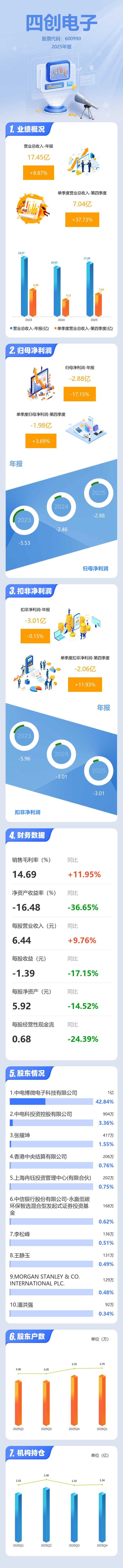 证券之星消息,四创电子2025年年报显示,当年度公司主营收入17.45亿元,同比上升8.87%;归母净利润-2.88亿元,同比下降17.15%;扣非净利润-3.01亿元,同比下降0.15%;其中2025年第四季度,公司单季度主营收入7.04亿元,同比上升37.74%;单季度归母净利润-1.98亿元,同比上升3.69%;单季度扣非净利润-2.06亿元,同比上升11.93%;负债率71.98%,投资收益131.3万元,财务费用4730.87万元,毛利率14.69%。