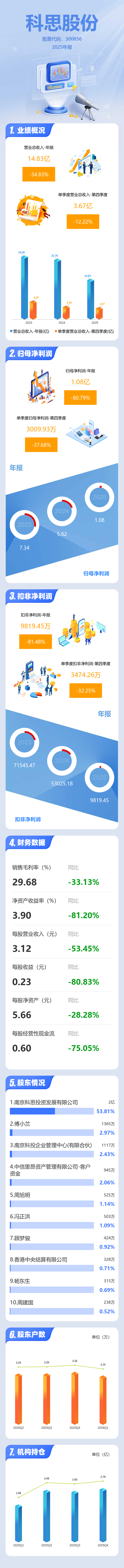 证券之星消息,科思股份2025年年报显示,当年度公司主营收入14.83亿元,同比下降34.83%;归母净利润1.08亿元,同比下降80.79%;扣非净利润9819.45万元,同比下降81.48%;其中2025年第四季度,公司单季度主营收入3.67亿元,同比下降12.22%;单季度归母净利润3009.93万元,同比下降37.68%;单季度扣非净利润3474.26万元,同比下降32.25%;负债率30.44%,投资收益498.38万元,财务费用3440.02万元,毛利率29.68%。
