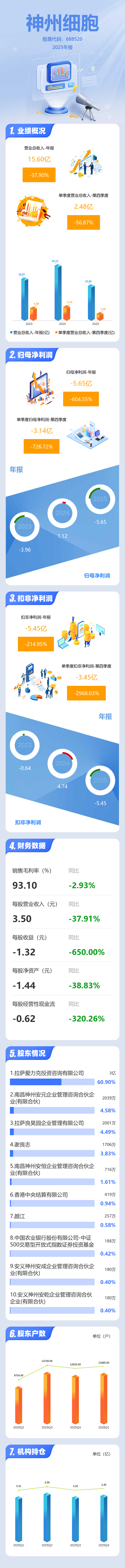 证券之星消息,神州细胞2025年年报显示,当年度公司主营收入15.6亿元,同比下降37.91%;归母净利润-5.65亿元,同比下降604.55%;扣非净利润-5.45亿元,同比下降214.96%;其中2025年第四季度,公司单季度主营收入2.48亿元,同比下降56.88%;单季度归母净利润-3.14亿元,同比下降726.72%;单季度扣非净利润-3.45亿元,同比下降2968.04%;负债率96.85%,投资收益125.39万元,财务费用8597.17万元,毛利率93.1%。