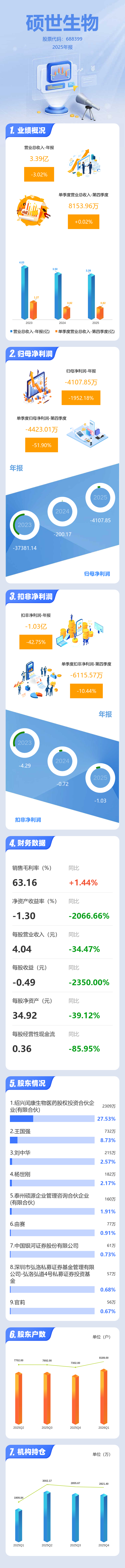 证券之星消息,硕世生物2025年年报显示,当年度公司主营收入3.39亿元,同比下降3.02%;归母净利润-4107.85万元,同比下降1952.18%;扣非净利润-1.03亿元,同比下降42.75%;其中2025年第四季度,公司单季度主营收入8153.96万元,同比上升0.02%;单季度归母净利润-4423.01万元,同比下降51.91%;单季度扣非净利润-6115.57万元,同比下降10.45%;负债率17.6%,投资收益697.95万元,财务费用227.43万元,毛利率63.16%。