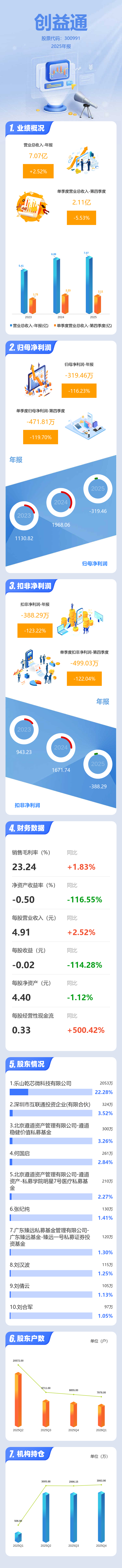 证券之星消息,创益通2025年年报显示,当年度公司主营收入7.07亿元,同比上升2.53%;归母净利润-319.46万元,同比下降116.23%;扣非净利润-388.29万元,同比下降123.23%;其中2025年第四季度,公司单季度主营收入2.11亿元,同比下降5.53%;单季度归母净利润-471.81万元,同比下降119.71%;单季度扣非净利润-499.03万元,同比下降122.04%;负债率50.43%,投资收益57.82万元,财务费用1445.99万元,毛利率23.24%。