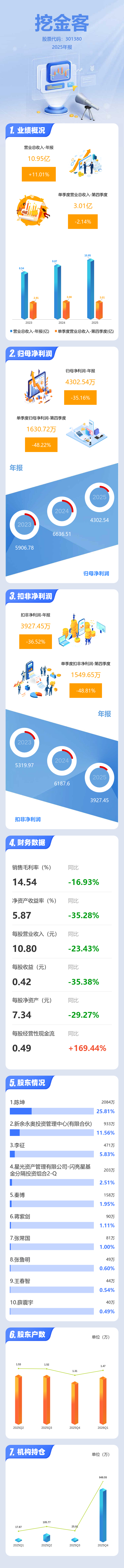 证券之星消息,挖金客2025年年报显示,当年度公司主营收入10.95亿元,同比上升11.02%;归母净利润4302.54万元,同比下降35.17%;扣非净利润3927.45万元,同比下降36.53%;其中2025年第四季度,公司单季度主营收入3.01亿元,同比下降2.15%;单季度归母净利润1630.72万元,同比下降48.22%;单季度扣非净利润1549.65万元,同比下降48.82%;负债率42.68%,投资收益150.62万元,财务费用864.8万元,毛利率14.54%。