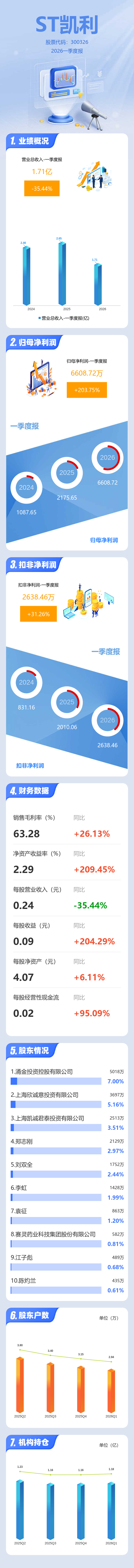 证券之星消息,ST凯利2026年一季报显示,一季度公司主营收入1.71亿元,同比下降35.44%;归母净利润6608.72万元,同比上升203.76%;扣非净利润2638.46万元,同比上升31.26%;负债率5.64%,投资收益4220.91万元,财务费用-150.19万元,毛利率63.28%。