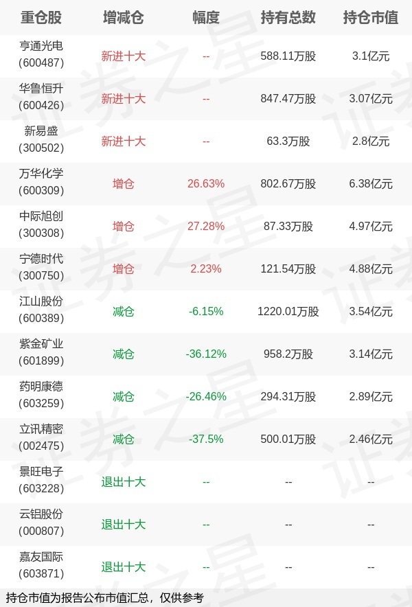证券之星消息,4月22日中欧基金旗下周蔚文 罗佳明管理的中欧时代先锋股票型发起式基金公布一季报,近1年净值增长率75.74%。与上一季度相比,该基金前十大重仓股新增亨通光电,华鲁恒升,新易盛;并对万华化学增仓168.81万股,为该基金第一大重仓股;景旺电子,云铝股份,嘉友国际等退出前十大重仓股;详细数据如下:以上内容为证券之星据公开信息整理,由AI算法生成(网信算备310104345710301240019号),不构成投资建议。