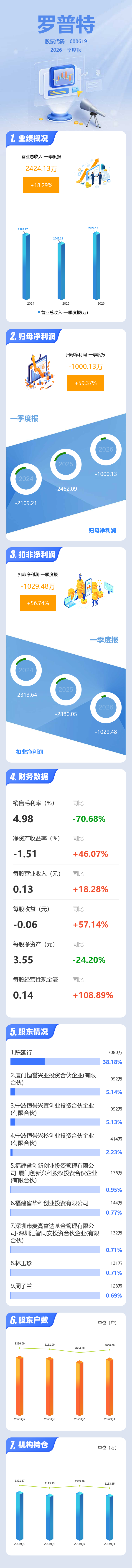 证券之星消息,罗普特2026年一季报显示,一季度公司主营收入2424.13万元,同比上升18.29%;归母净利润-1000.13万元,同比上升59.38%;扣非净利润-1029.48万元,同比上升56.75%;负债率46.19%,投资收益-86.13万元,财务费用42.04万元,毛利率4.98%。