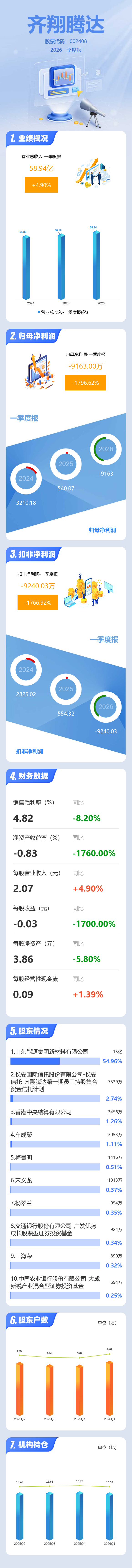 证券之星消息,齐翔腾达2026年一季报显示,一季度公司主营收入58.94亿元,同比上升4.91%;归母净利润-9163.0万元,同比下降1796.62%;扣非净利润-9240.03万元,同比下降1766.92%;负债率56.63%,投资收益-620.0万元,财务费用6504.55万元,毛利率4.82%。