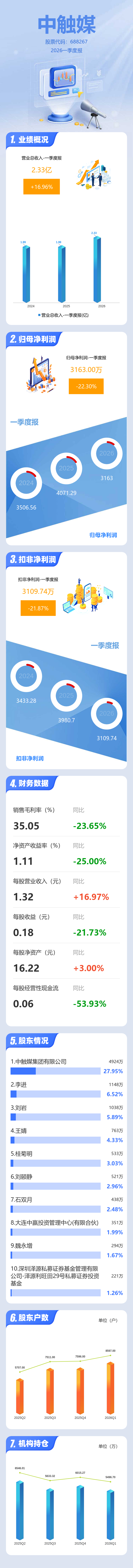 证券之星消息,中触媒2026年一季报显示,一季度公司主营收入2.33亿元,同比上升16.96%;归母净利润3163.0万元,同比下降22.31%;扣非净利润3109.74万元,同比下降21.88%;负债率6.66%,投资收益56.25万元,财务费用373.63万元,毛利率35.05%。