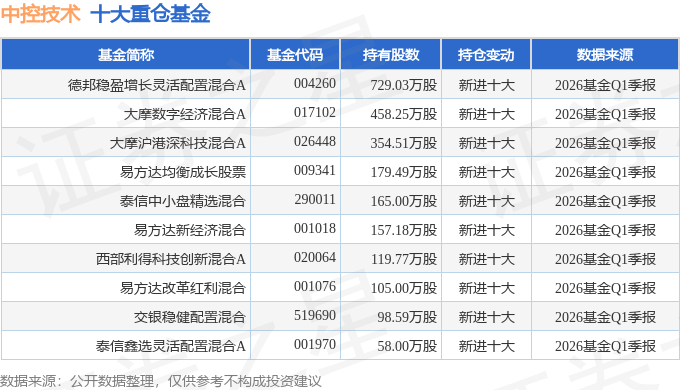 持有中控技术最多的基金为德邦稳盈增长灵活配置混合A,目前规模为2.67亿元,最新净值1.0505(4月21日),较上一交易日下跌1.15%,近一年上涨20.28%。该基金现任基金经理为雷涛 陆阳。