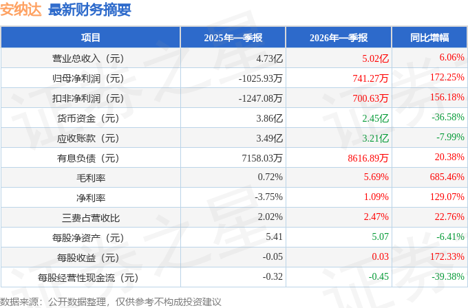 据证券之星公开数据整理,近期安纳达(002136)发布2026年一季报。截至本报告期末,公司营业总收入5.02亿元,同比上升6.06%,归母净利润741.27万元,同比上升172.25%。按单季度数据看,第一季度营业总收入5.02亿元,同比上升6.06%,第一季度归母净利润741.27万元,同比上升172.25%。本报告期安纳达盈利能力上升,毛利率同比增幅685.46%,净利率同比增幅129.07%。