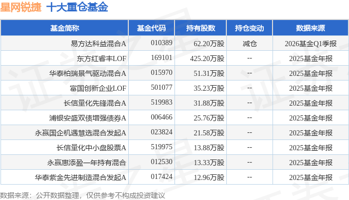 持有星网锐捷最多的基金为易方达科益混合A,目前规模为3.3亿元,最新净值1.4432(4月21日),较上一交易日下跌0.74%,近一年上涨75.74%。该基金现任基金经理为彭珂 黄蕴藉。
