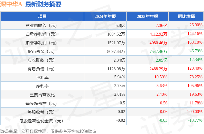 据证券之星公开数据整理,近期深中华A(000017)发布2025年年报。截至本报告期末,公司营业总收入7.36亿元,同比上升26.9%,归母净利润4112.92万元,同比上升144.16%。按单季度数据看,第四季度营业总收入1.58亿元,同比下降47.34%,第四季度归母净利润1019.19万元,同比上升8.16%。本报告期深中华A盈利能力上升,毛利率同比增幅78.25%,净利率同比增幅105.96%。