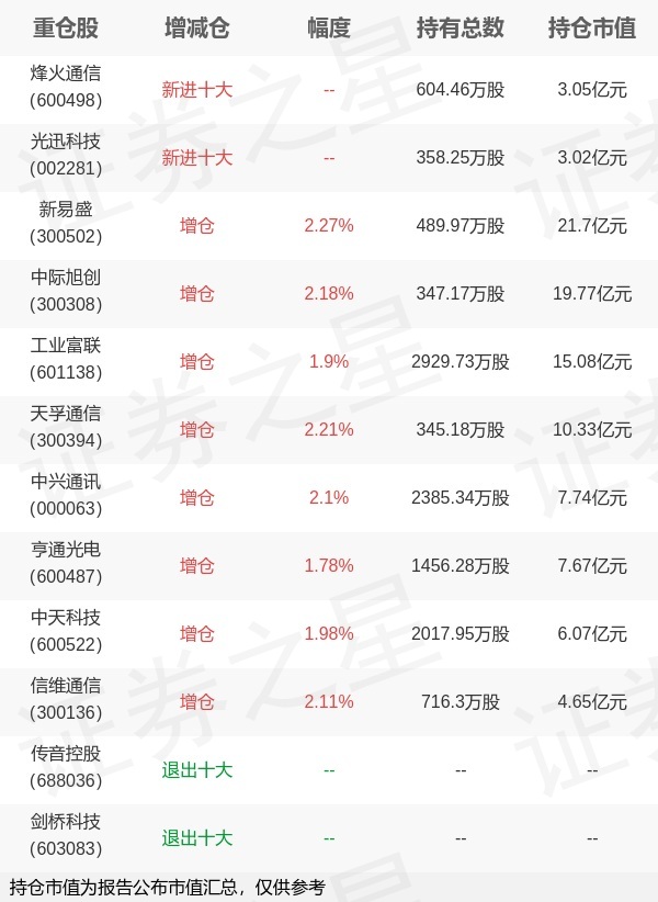 证券之星消息,4月22日国泰基金旗下艾小军管理的国泰中证全指通信设备交易型开放式指数基金公布一季报,近1年净值增长率248.49%。与上一季度相比,该基金前十大重仓股新增烽火通信,光迅科技;并对新易盛增仓10.89万股,为该基金第一大重仓股;传音控股,剑桥科技等退出前十大重仓股;详细数据如下:以上内容为证券之星据公开信息整理,由AI算法生成(网信算备310104345710301240019号),不构成投资建议。
