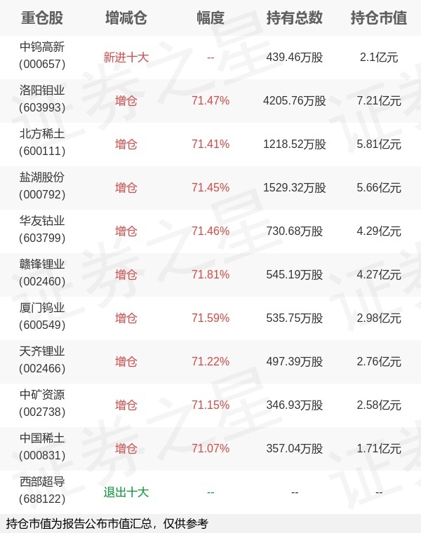 证券之星消息,4月22日嘉实基金旗下田光远管理的嘉实中证稀有金属主题交易型开放式指数基金公布一季报,近1年净值增长率130.99%。与上一季度相比,该基金前十大重仓股新增中钨高新;并对洛阳钼业增仓1752.93万股,为该基金第一大重仓股;西部超导等退出前十大重仓股;详细数据如下:以上内容为证券之星据公开信息整理,由AI算法生成(网信算备310104345710301240019号),不构成投资建议。