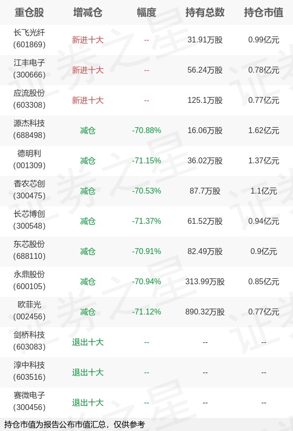 证券之星消息,4月22日南方基金旗下崔蕾管理的南方中证1000交易型开放式指数基金公布一季报,近1年净值增长率42.24%。与上一季度相比,该基金前十大重仓股新增长飞光纤,江丰电子,应流股份;其中源杰科技持仓占比0.7%,为该基金第一大重仓股;剑桥科技,淳中科技,赛微电子等退出前十大重仓股;详细数据如下: