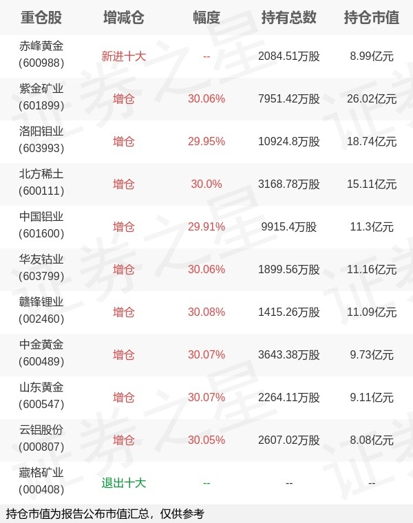 证券之星消息,4月22日南方基金旗下崔蕾管理的南方中证申万有色金属交易型开放式指数基金公布一季报,近1年净值增长率106.66%。与上一季度相比,该基金前十大重仓股新增赤峰黄金;并对紫金矿业增仓1837.69万股,为该基金第一大重仓股;藏格矿业等退出前十大重仓股;详细数据如下:以上内容为证券之星据公开信息整理,由AI算法生成(网信算备310104345710301240019号),不构成投资建议。相关 ETF