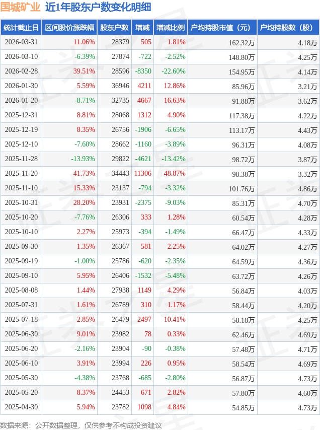 从股价来看,2026年3月10日至2026年3月31日,国城矿业区间涨幅为11.06%,在此期间股东户数增加505.0户,增幅为1.81%。
