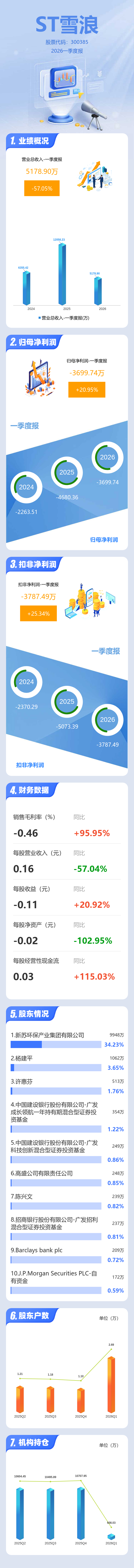 证券之星消息,ST雪浪2026年一季报显示,一季度公司主营收入5178.9万元,同比下降57.05%;归母净利润-3699.74万元,同比上升20.95%;扣非净利润-3787.49万元,同比上升25.35%;负债率97.22%,投资收益68.18万元,财务费用913.9万元,毛利率-0.46%。