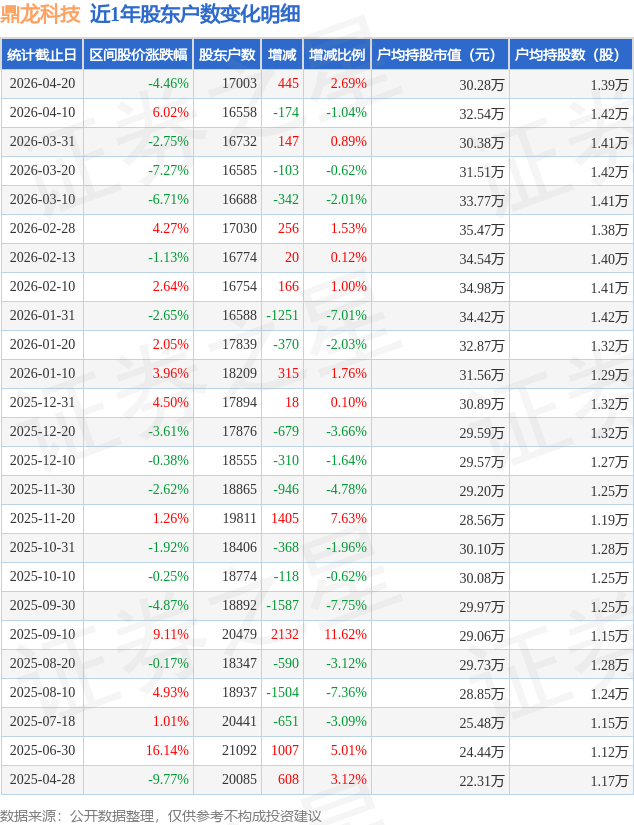 证券之星消息,近日鼎龙科技披露,截至2026年4月20日公司股东户数为1.7万户,较4月10日增加445.0户,增幅为2.69%。户均持股数量由上期的1.42万股减少至1.39万股,户均持股市值为30.28万元。