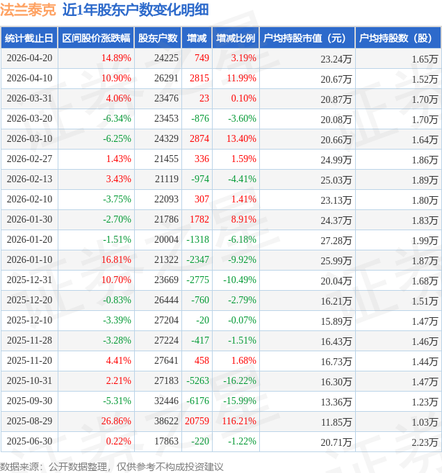 从股价来看,2026年3月31日至2026年4月20日,法兰泰克区间涨幅为14.89%,在此期间股东户数增加749.0户,增幅为3.19%。