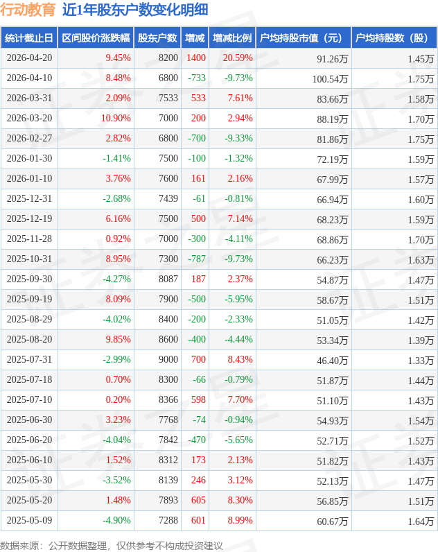 证券之星消息,近日行动教育披露,截至2026年4月20日公司股东户数为8200.0户,较4月10日增加1400.0户,增幅为20.59%。户均持股数量由上期的1.75万股减少至1.45万股,户均持股市值为91.26万元。
