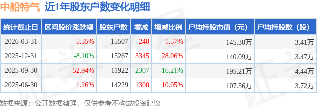 从股价来看,2025年12月31日至2026年3月31日,中船特气区间涨幅为5.35%,在此期间股东户数增加240.0户,增幅为1.57%。