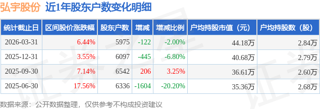 从股价来看,2025年12月31日至2026年3月31日,弘宇股份区间涨幅为6.44%,在此期间股东户数减少122.0户,减幅为2.0%。