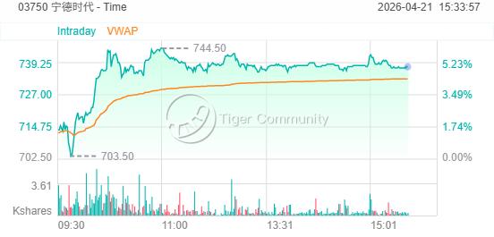 4月21日,宁德时代港股盘中涨幅一度超过6%,股价高见745港元,刷新上市以来历史新高;宁德时代A股同日涨幅近4%,报447.6元/股,市值超过2万亿元。