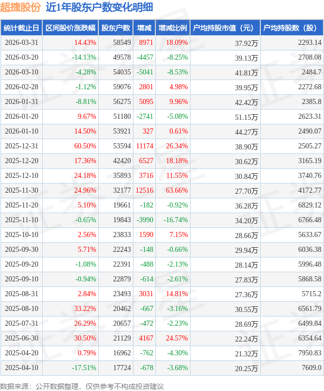 从股价来看,2026年3月20日至2026年3月31日,超捷股份区间涨幅为14.43%,在此期间股东户数增加8971.0户,增幅为18.09%。