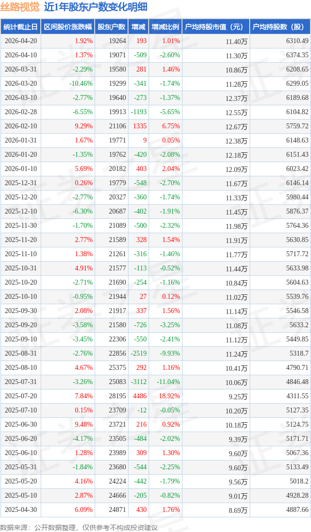 从股价来看,2026年4月10日至2026年4月20日,丝路视觉区间涨幅为1.92%,在此期间股东户数增加193.0户,增幅为1.01%。