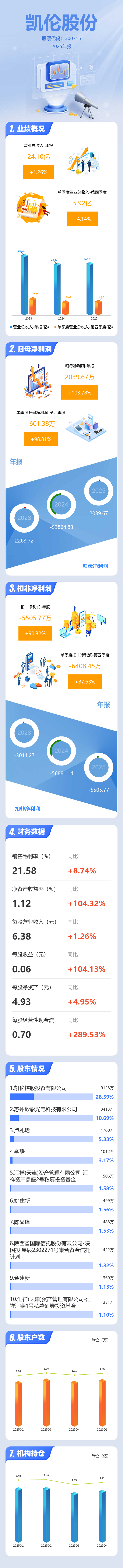 证券之星消息,凯伦股份2025年年报显示,当年度公司主营收入24.1亿元,同比上升1.26%;归母净利润2039.67万元,同比上升103.79%;扣非净利润-5505.77万元,同比上升90.32%;其中2025年第四季度,公司单季度主营收入5.92亿元,同比上升4.14%;单季度归母净利润-601.38万元,同比上升98.81%;单季度扣非净利润-6408.45万元,同比上升87.63%;负债率63.95%,投资收益-758.74万元,财务费用4921.91万元,毛利率21.58%。