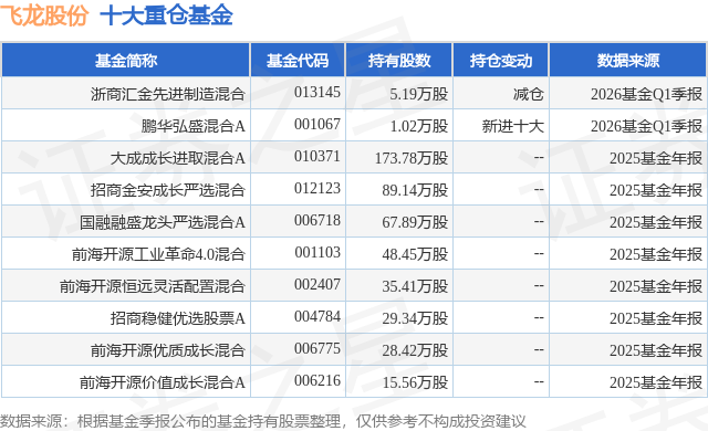 重仓飞龙股份的前十大公募基金请见下表: