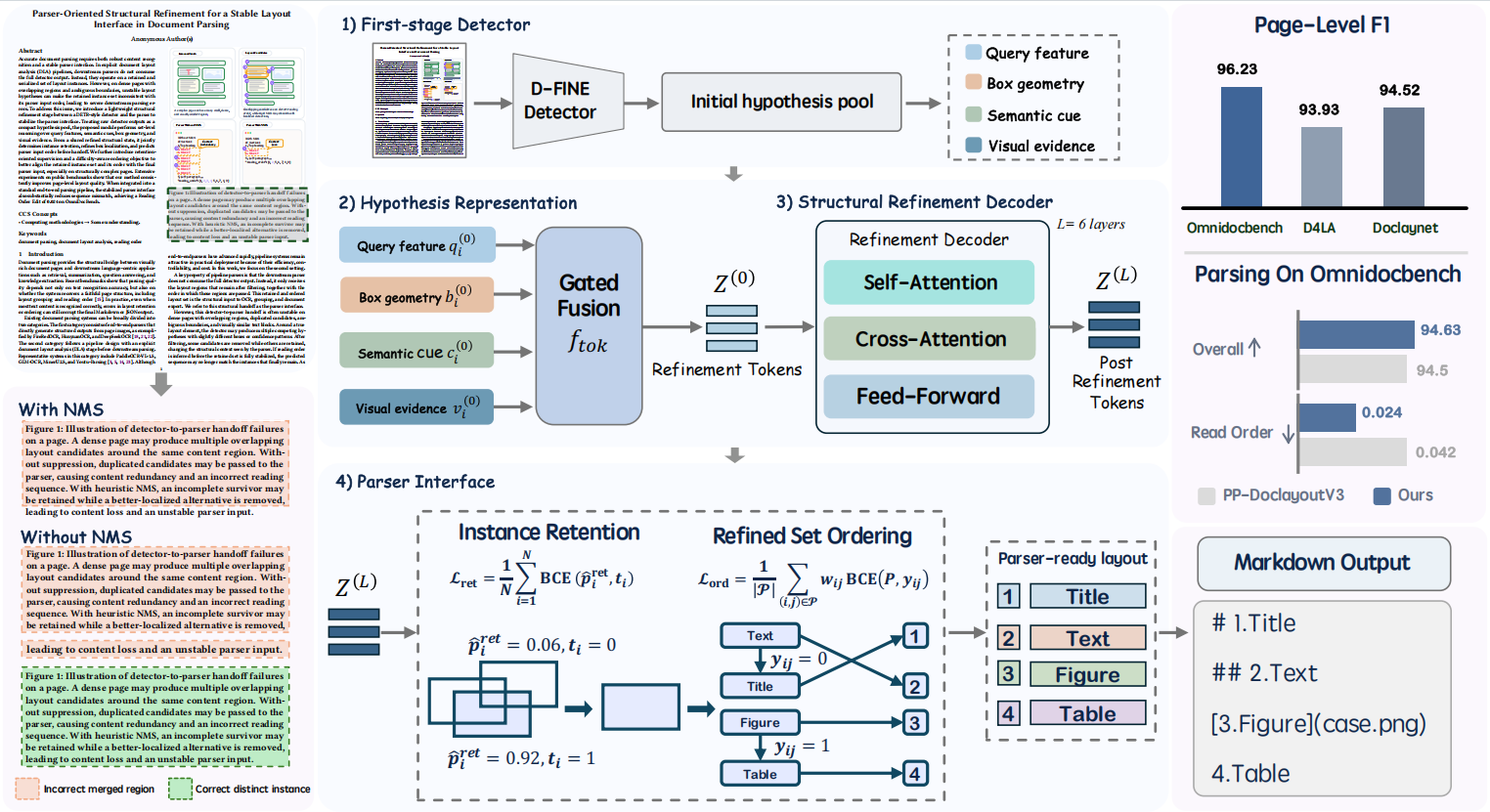 引入保留导向监督目标,让模型通过学习建模候选区域之间的结构竞争关系,而非依赖固定的IoU抑制规则决定区域去留,减少复杂页面中因机械过滤导致的内容缺失与结构破坏。