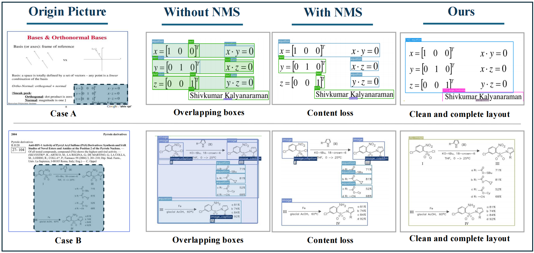 若不对这些候选框做处理,直接送入下游解析器(Parser),会导致内容重复、结构混乱,甚至打乱正常阅读顺序。传统行业内解决方案通常采用非极大值抑制(NMS)进行候选框去重,即在多个重叠区域中删除重复结果、保留一个候选框。但在真实复杂页面中,仅靠启发式NMS往往不够稳定:多个候选框虽指向同一内容,但完整性和定位质量存在差异,NMS只能完成“去重”,却未必能保留“最适合下游解析”的区域,反而可能误删定位更准、覆盖更全的区域。