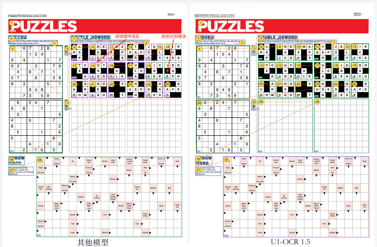 在OmniDocBench数据集上,U1-OCR 同时展现出出色的综合解析能力与阅读顺序恢复能力:
