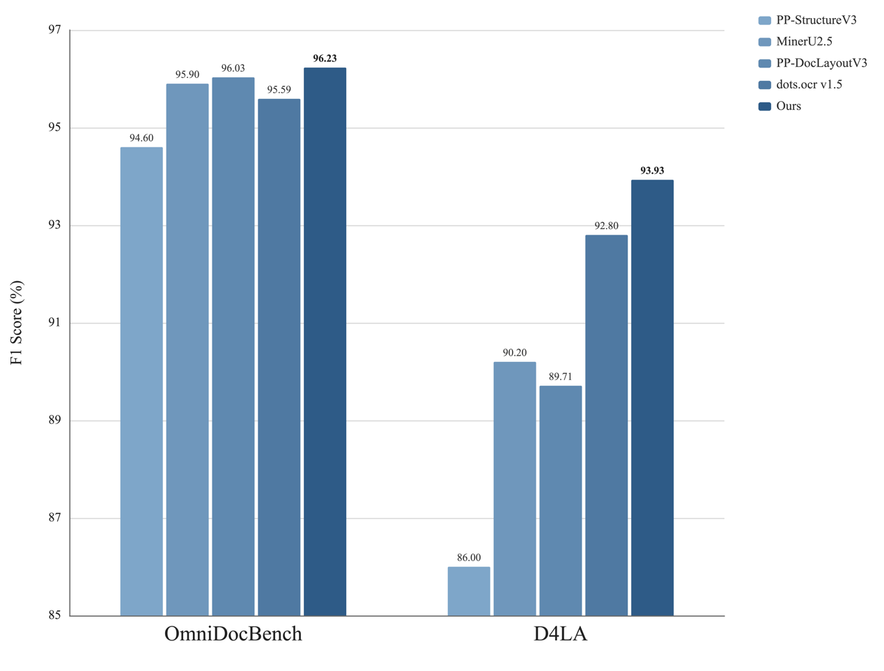 在OmniDocBench数据集上,我们的产品F1分数达96.23,优于PP-DocLayoutV3(96.03)、MinerU2.5(95.90)、dots.ocr v1.5(95.59)及PP-StructureV3(94.60);在D4LA数据集上,我们以93.93的F1分数登顶,领先dots.ocr v1.5(92.80)、MinerU2.5(90.20)、PP-DocLayoutV3(89.71)和PP-StructureV3(86.00)。