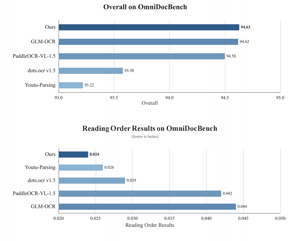 从综合指标Overall来看,我们的产品以94.63的分数略高于GLM-OCR(94.62),优于PaddleOCR-VL-1.5(94.50)、dots.ocr v1.5(93.58)及Youtu-Parsing(93.22),彰显端到端文档解析的稳定竞争力;从阅读顺序核心指标Read Order Edit来看,我们取得0.024的最优结果(该指标越低越好),远优于Youtu-Parsing(0.026)、dots.ocr v1.5(0.029)、PaddleOCR-VL-1.5(0.042)和GLM-OCR(0.044)。