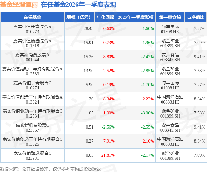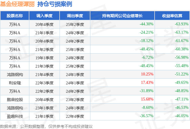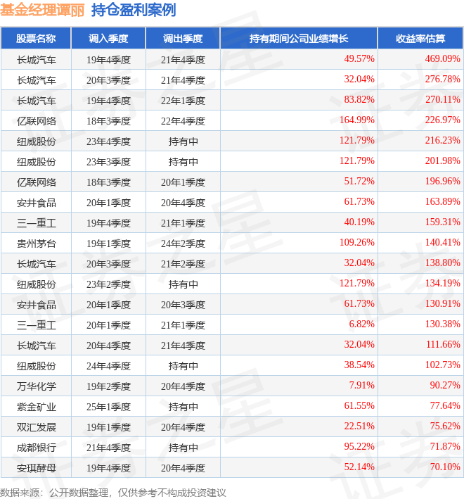 重仓股调仓示例详解:1、长城汽车(601633)翻倍案例:谭丽管理的嘉实新消费股票A基金在19年4季度买入长城汽车,在持有2年又0个季度后在21年4季度卖出。持有期间的估算收益率为469.09%,持有期间长城汽车在2019年到2021年的年报归属净利润增幅达49.57%。2、万华化学(600309)调仓案例:谭丽管理的嘉实丰和灵活配置混合A基金在19年2季度买入万华化学,在持有1年又2个季度后在20年4季度卖出。持有期间的估算收益率为90.27%,持有期间万华化学在2019年到2020年的年报营业总收入增幅达7.91%。3、万科A(000002)折戟案例:谭丽管理的嘉实价值精选股票A基金在20年4季度买入万科A,在持有4年又2个季度后在25年2季度卖出。持有期间的估算收益率为-63.93%,持有期间万科A在2020年到2025年的年报营业总收入降幅为44.3%。