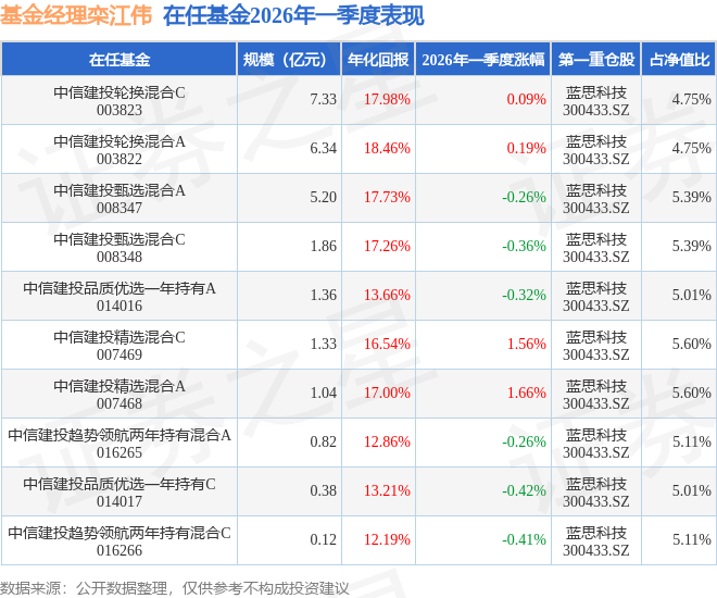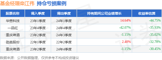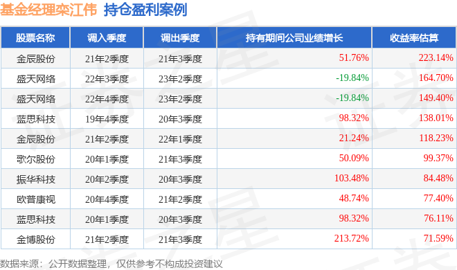 重仓股调仓示例详解:1、金辰股份(603396)翻倍案例:栾江伟管理的中信建投甄选混合A基金在21年2季度买入金辰股份,在持有1个季度后在21年3季度卖出。持有期间的估算收益率为223.14%,持有期间金辰股份在2020年到2021年的年报营业总收入增幅达51.76%。2、歌尔股份(002241)调仓案例:栾江伟管理的中信建投轮换混合A基金在20年1季度买入歌尔股份,在持有1年又2个季度后在21年3季度卖出。持有期间的估算收益率为99.37%,持有期间歌尔股份在2020年到2021年的年报归属净利润增幅达50.09%。3、华懋科技(603306)调仓案例:栾江伟管理的中信建投趋势领航两年持有混合A基金在23年1季度买入华懋科技,在持有1年又0个季度后在24年1季度卖出。持有期间的估算收益率为-44.75%,持有期间华懋科技在2023年到2024年的年报归属净利润增幅达14.64%。