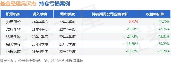 重仓股调仓示例详解:1、长城汽车(601633)翻倍案例:冯汉杰管理的中加转型动力混合A基金在19年1季度买入长城汽车,在持有2年又3个季度后在21年4季度卖出。持有期间的估算收益率为601.57%,持有期间长城汽车在2019年到2021年的年报归属净利润增幅达49.57%。2、海利得(002206)调仓案例:冯汉杰管理的中加核心智造混合A基金在20年3季度买入海利得,在持有1年又1个季度后在21年4季度卖出。持有期间的估算收益率为91.29%,持有期间海利得在2020年到2021年的年报归属净利润增幅达128.53%。3、力星股份(300421)调仓案例:冯汉杰管理的中加聚优一年定开混合A基金在21年4季度买入力星股份,在持有2个季度后在22年2季度卖出。持有期间的估算收益率为-47.7%,持有期间力星股份在2021年到2022年的年报营业总收入增幅达0.71%。
