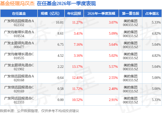 证券之星消息,截止2026年一季度末,基金经理冯汉杰旗下共管理8只基金,本季度表现最佳的为广发主题领先混合A(000477),季度净值涨5.64%。
