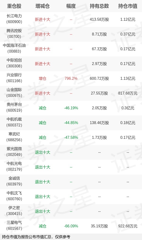 证券之星消息,4月22日广发基金旗下曹建文管理的广发智荟多元配置六个月持有期混合型基金中基金(FOF)公布一季报。与上一季度相比,该基金前十大重仓股新增长江电力,腾讯控股,中国海洋石油,中际旭创,山金国际;并对兴业银行增仓533.69万股,为该基金第一大重仓股;紫光国微,中航光电,金诚信,中航沈飞,伊之密等退出前十大重仓股;详细数据如下: