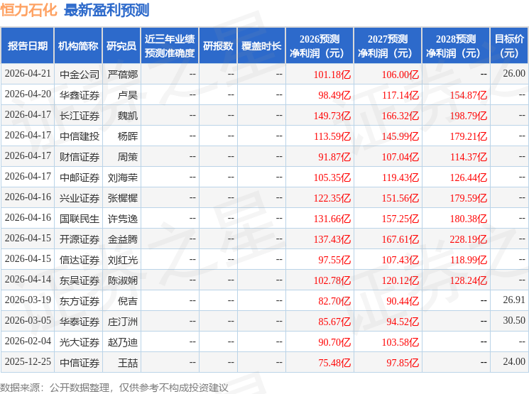 东吴证券股份有限公司陈淑娴,周少玟近期对恒力石化进行研究并发布了研究报告《2026年一季报点评:炼化龙头盈利水平显著提升,地缘冲突推动行业持续高景气》,给予恒力石化买入评级。
