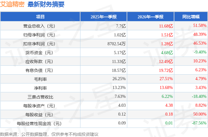 据证券之星公开数据整理,近期艾迪精密(603638)发布2026年一季报。截至本报告期末,公司营业总收入11.68亿元,同比上升51.58%,归母净利润1.51亿元,同比上升48.39%。按单季度数据看,第一季度营业总收入11.68亿元,同比上升51.58%,第一季度归母净利润1.51亿元,同比上升48.39%。本报告期艾迪精密盈利能力上升,毛利率同比增幅4.79%,净利率同比增幅3.43%。
