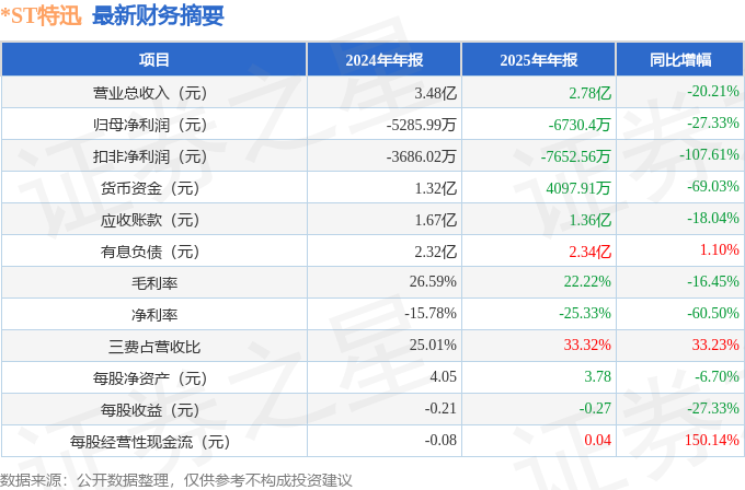 据证券之星公开数据整理,近期*ST特迅(002227)发布2025年年报。截至本报告期末,公司营业总收入2.78亿元,同比下降20.21%,归母净利润-6730.4万元,同比下降27.33%。按单季度数据看,第四季度营业总收入9399.29万元,同比下降25.75%,第四季度归母净利润-1777.56万元,同比上升39.63%。本报告期*ST特迅三费占比上升明显,财务费用、销售费用和管理费用总和占总营收同比增幅达33.23%。